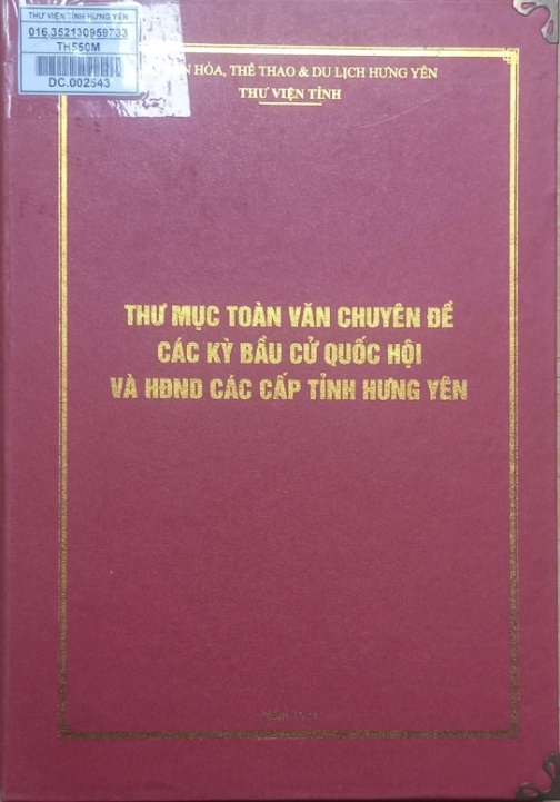 Nhân kỷ niệm 75 năm ngày Tổng tuyển cử đầu tiên bầu Quốc hội Việt Nam (06/01/1946 - 06/01/2021), Thư viện tỉnh Hưng Yên biên soạn Thư mục toàn văn chuyên đề “Các kỳ bầu cử Quốc hội và Hội đồng nhân dân tỉnh Hưng Yên” nhằm cung cấp và hệ thống các tư liệu về các kỳ bầu cử Quốc hội và Hội đồng nhân dân, giúp bạn đọc có cái nhìn khái quát quá trình phát triển của Quốc hội Việt Nam, Đoàn đại biểu Quốc hội và Hội đồng nhân dân tỉnh Hưng Yên. Thư mục gồm 2 phần:
