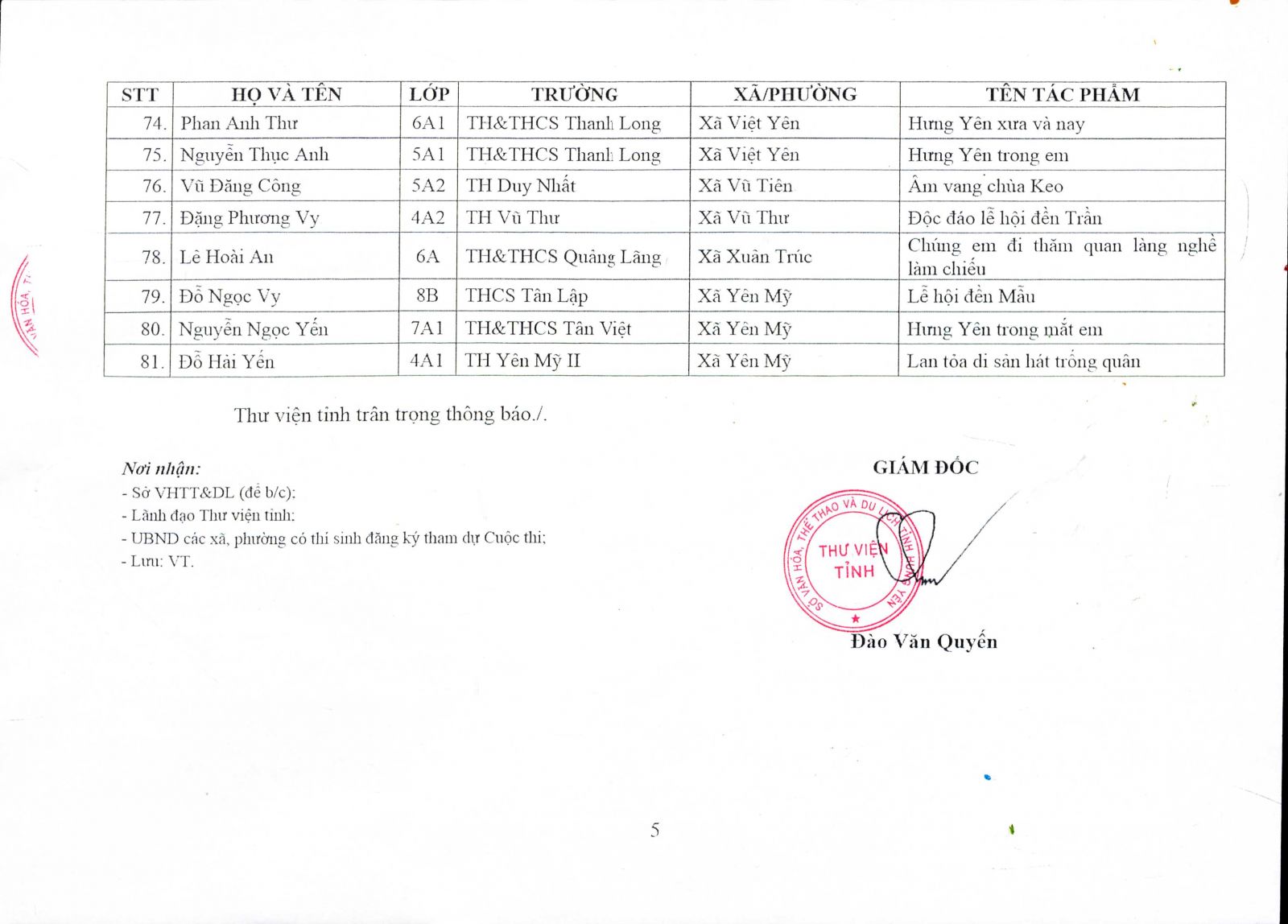 Thông báo kết quả vòng sơ khảo Cuộc thi "Đại sứ Văn hóa đọc năm 2024" tỉnh Hưng Yên(31/07/2024})