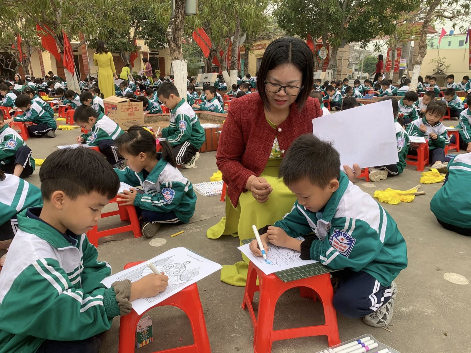 Hình ảnh 8: Cô giáo Trần Thị Loan, Hiệu trưởng Trường Tiểu học Nam Cao trao quà cho các bạn nhỏ phần tô tranh
