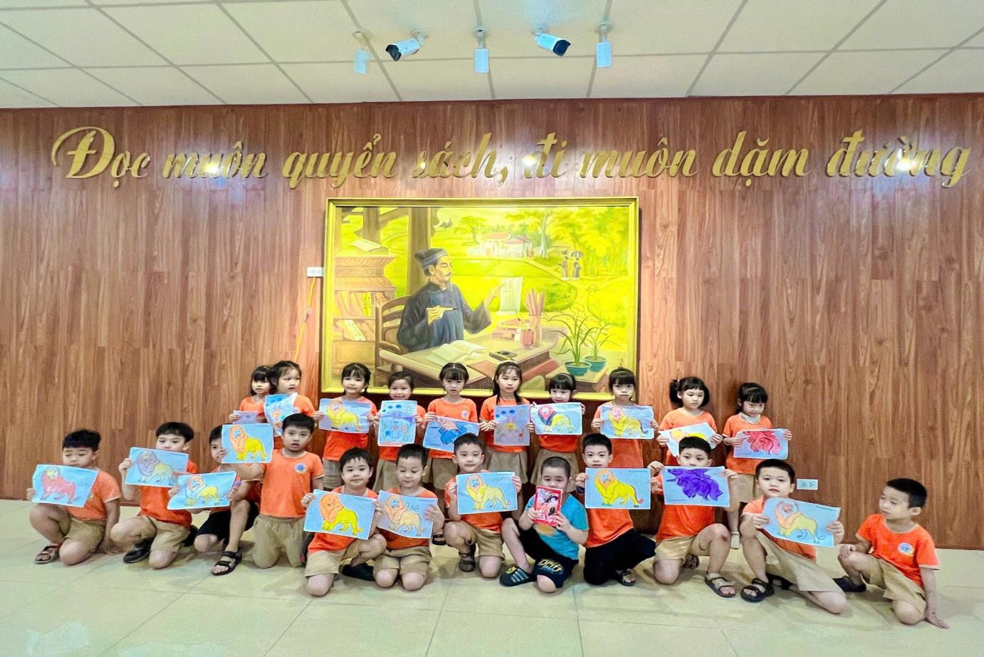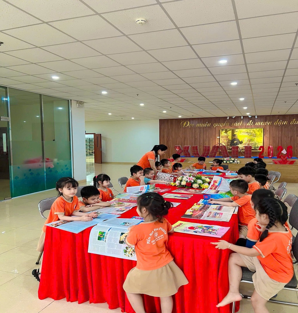 Bé được tự chọn sách yêu thích, ngồi vào bàn đọc hoặc ngồi trên thảm theo nhóm nhỏ, cùng nhau chia sẻ những câu chuyện hay. Ngoài ra, thư viện còn tổ chức những hoạt động bổ trợ như: kể chuyện sáng tạo, đố vui theo tranh, tô màu nhân vật trong truyện,... giúp bé tiếp thu kiến thức một cách nhẹ nhàng và hứng thú.