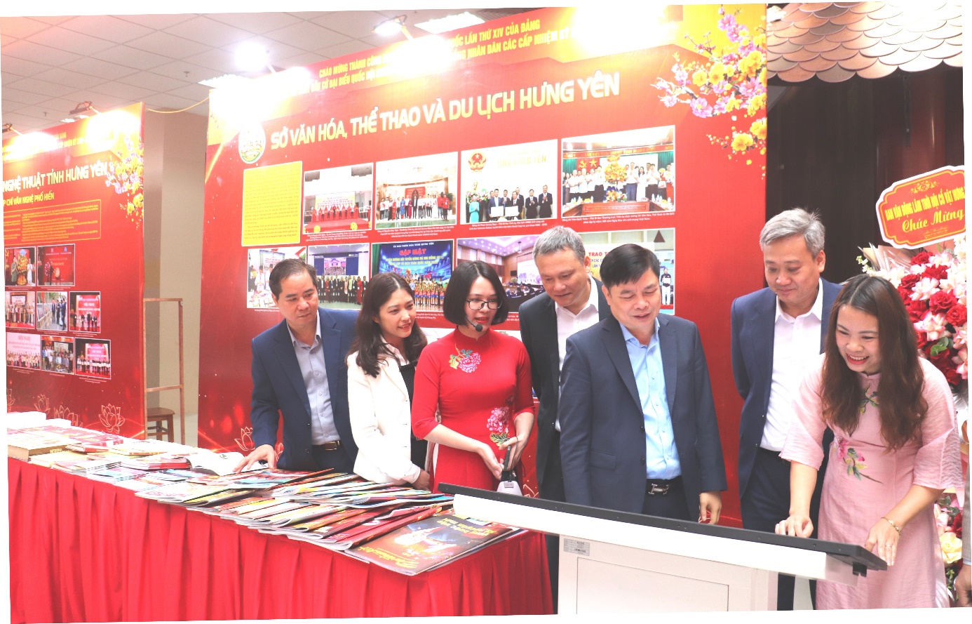 Các đồng chí: Đỗ Hữu Nhân, Tỉnh ủy viên, Giám đốc Sở Văn hóa, Thể thao và Du lịch; Hoàng Minh Sơn, Tỉnh ủy viên, Giám đốc Báo và Phát thanh, Truyền hình Hưng Yên thăm quan gian trưng bày của Sở Văn hóa, Thể thao và Du lịch
