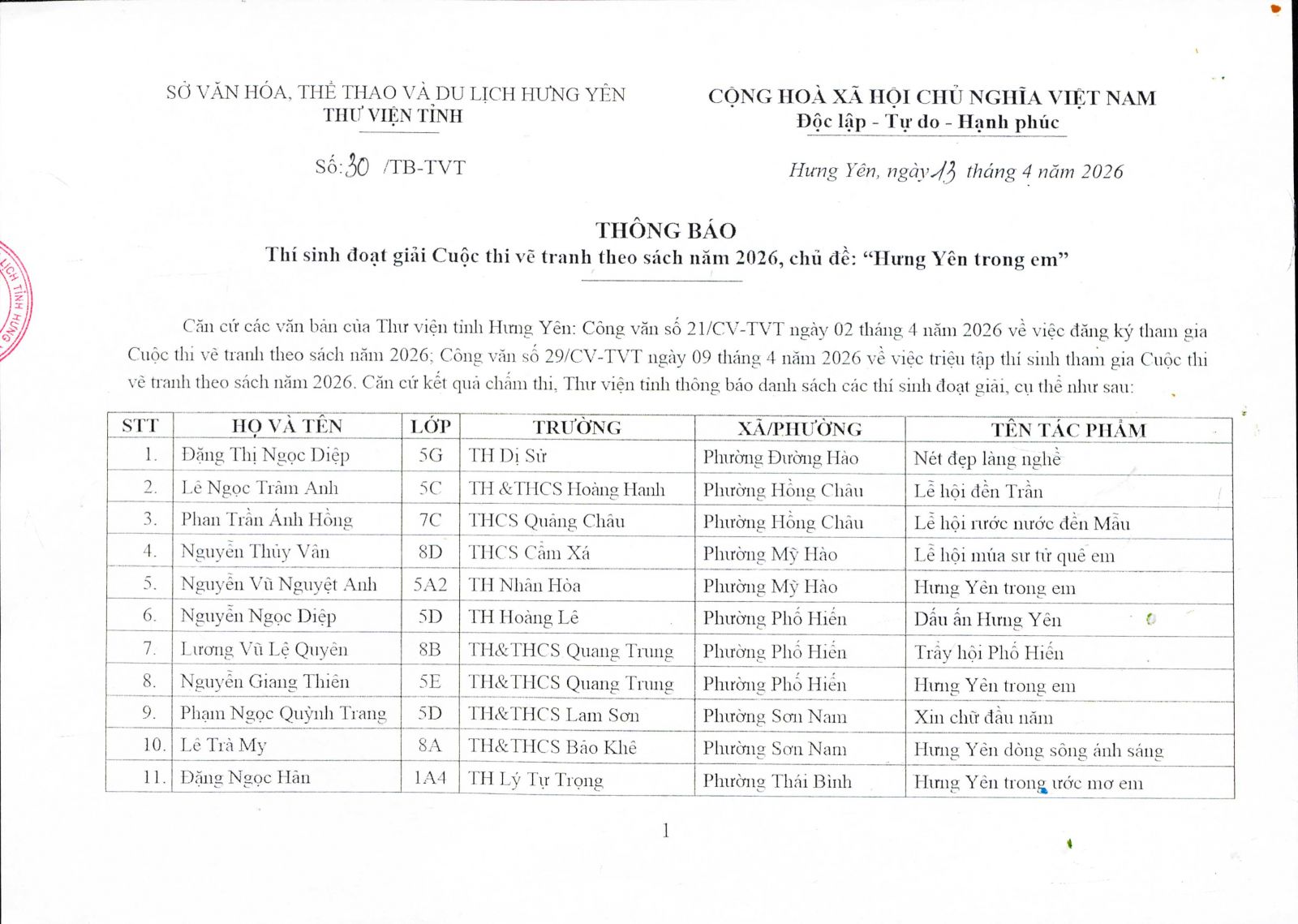 Thông báo danh sách thí sinh đoạt giải Cuộc thi vẽ tranh theo sách năm 2026(13/04/2026)
