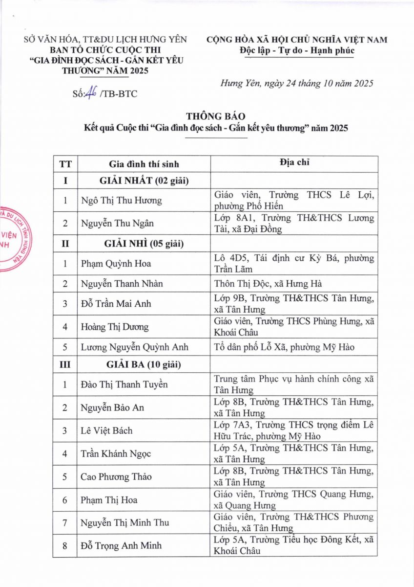 Thông báo kết quả Cuộc thi "Gia đình đọc sách - Gắn kết yêu thương" năm 2025(27/10/2025)
