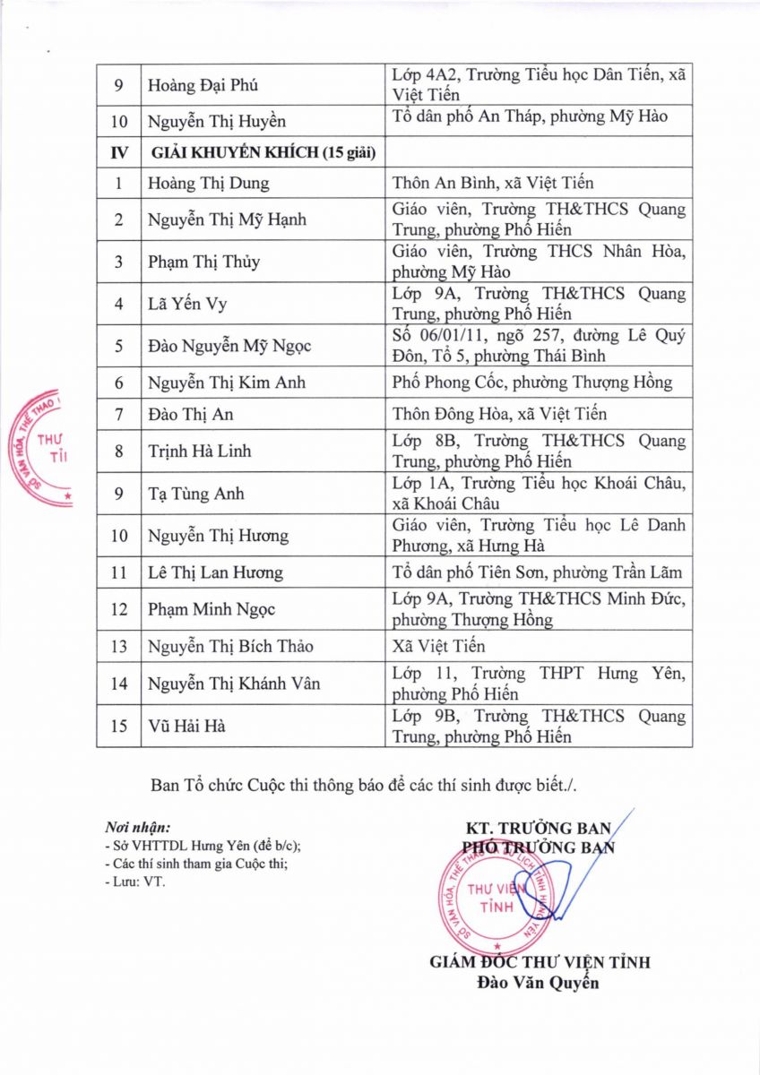 Thông báo kết quả vòng sơ khảo Cuộc thi "Đại sứ Văn hóa đọc năm 2024" tỉnh Hưng Yên(31/07/2024})