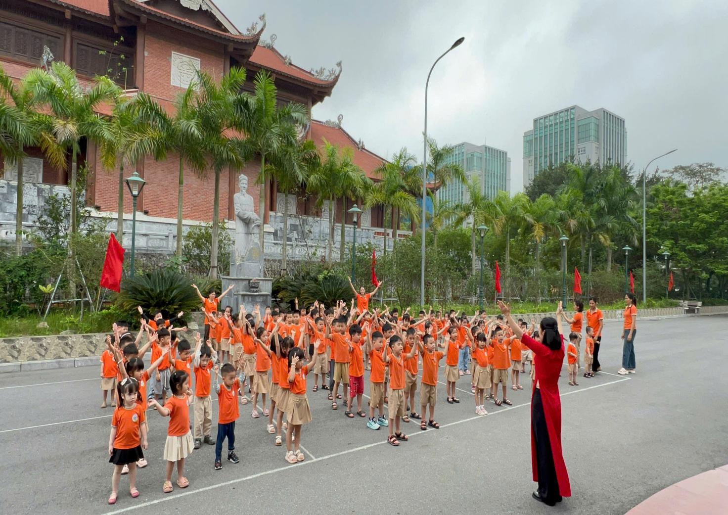 Các bé bắt đầu chuỗi hành trình trải nghiệm mở đầu bằng bài múa hát sôi động tại sân thư viện, được nghe giới thiệu về không gian của thư viện và các hoạt động trong buổi trải nghiệm.