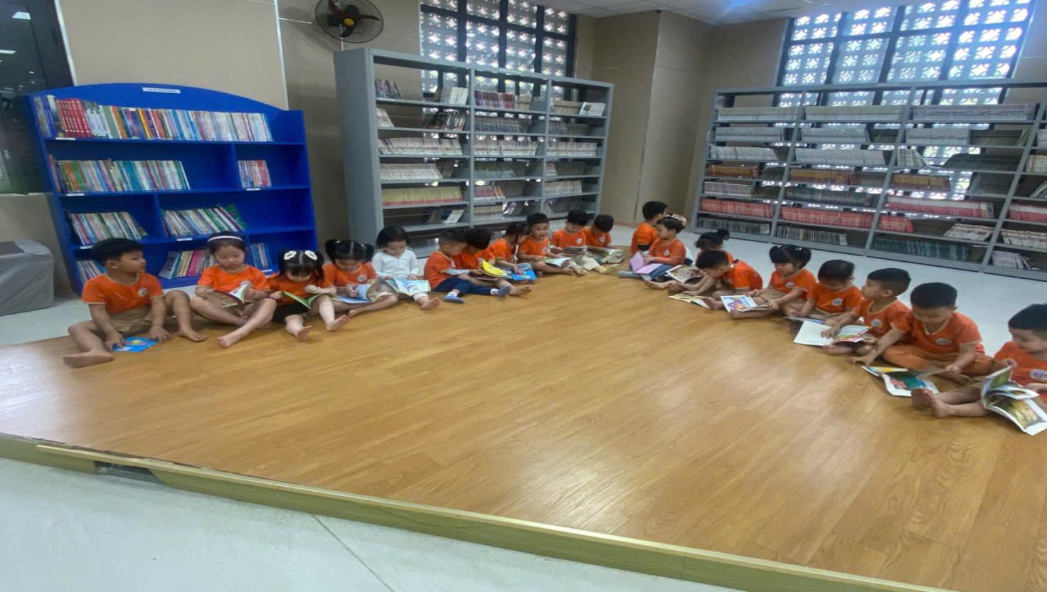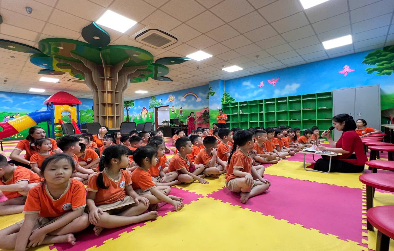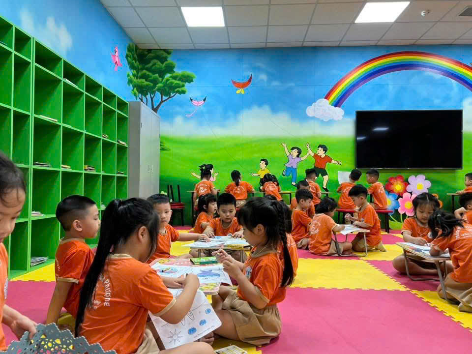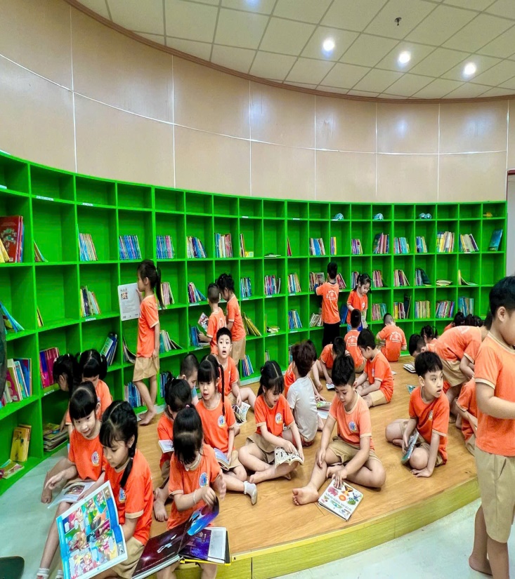 Bé được tự chọn sách yêu thích, ngồi vào bàn đọc hoặc ngồi trên thảm theo nhóm nhỏ, cùng nhau chia sẻ những câu chuyện hay. Ngoài ra, thư viện còn tổ chức những hoạt động bổ trợ như: kể chuyện sáng tạo, đố vui theo tranh, tô màu nhân vật trong truyện,... giúp bé tiếp thu kiến thức một cách nhẹ nhàng và hứng thú.