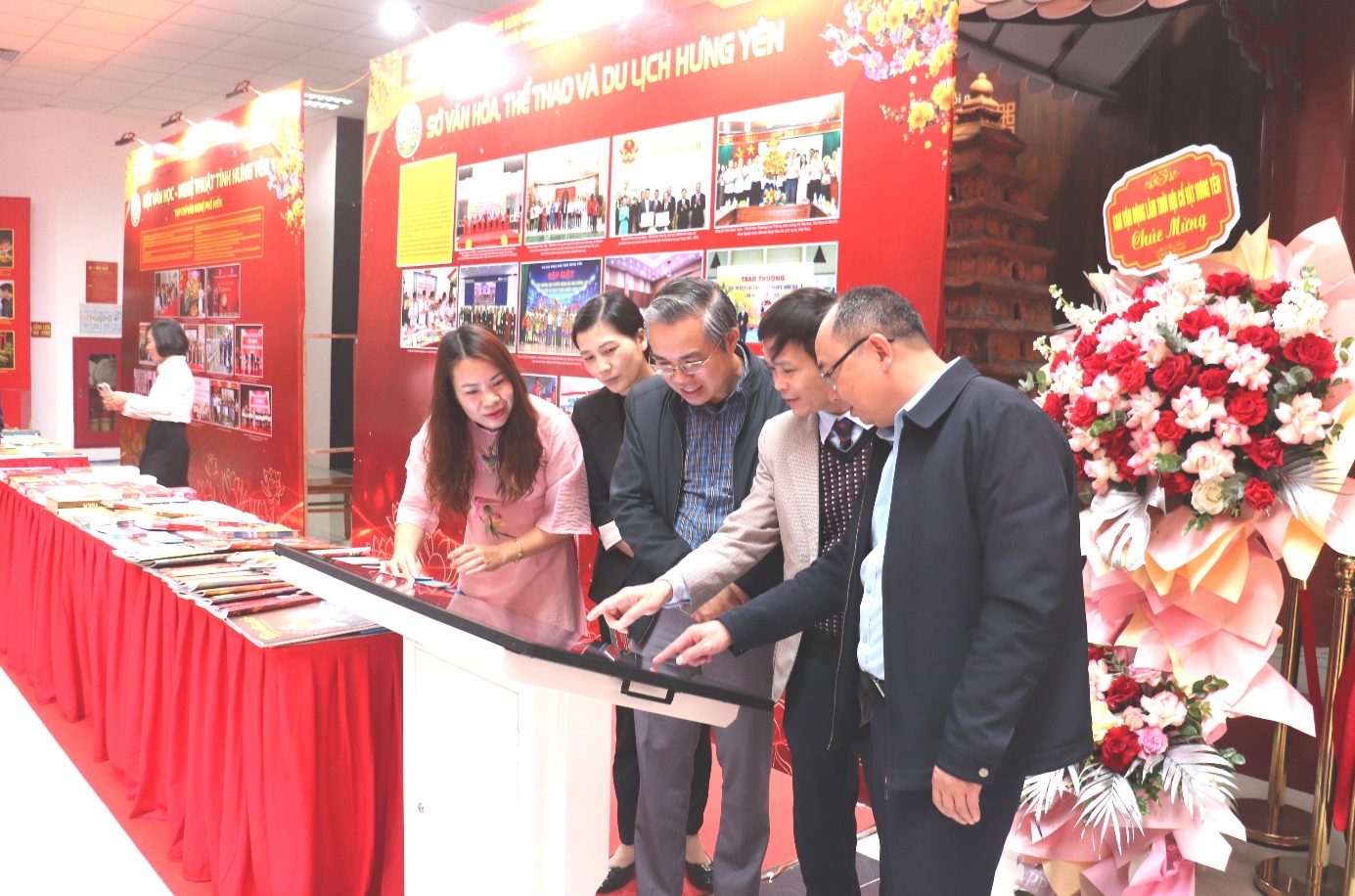 Các đồng chí: Đỗ Hữu Nhân, Tỉnh ủy viên, Giám đốc Sở Văn hóa, Thể thao và Du lịch; Hoàng Minh Sơn, Tỉnh ủy viên, Giám đốc Báo và Phát thanh, Truyền hình Hưng Yên thăm quan gian trưng bày của Sở Văn hóa, Thể thao và Du lịch