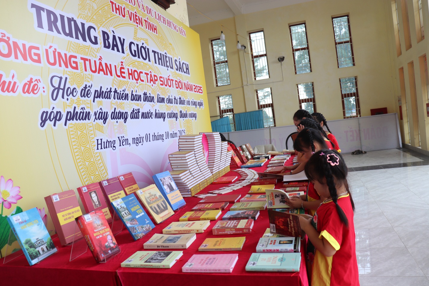 Hưởng ứng Tuần lễ học tập suốt đời năm 2025, Thư viện tỉnh tổ chức các hoạt động phong phú, sinh động, thiết thực như: Tuyên truyền bằng băngzôn, pano, khẩu hiệu về sách và văn hóa đọc; trưng bày, giới thiệu sách báo, tài liệu, xếp mô hình sách nghệ thuật tại Lễ khai mạc cấp tỉnh tổ chức tại trường THPT Chuyên Hưng Yên; phối hợp với UBND phường Sơn Nam tổ chức Lễ khai mạc, trưng bày, giới thiệu sách báo tại Nhà Văn hóa phường Sơn Nam; tặng sách cho 03 thư viện trường học trên địa bàn tỉnh; tổ chức phục vụ thư viện lưu động, luân chuyển sách báo về các thư viện trường học và cơ sở. Ngoài ra, nằm trong chuỗi các hoạt động Hưởng ứng Tuần lễ học tập suốt đời năm 2025, Thư viện tỉnh phối hợp với một số trường học tổ chức các hoạt động như: Tổ chức các buổi tọa đàm với chủ đề: “Ý thức tự học của học sinh qua sách, báo và tài liệu”; tổ chức nói chuyện chuyên đề; mời các thầy, cô giáo, nhà nghiên cứu, học sinh tiêu biểu chia sẻ kinh nghiệm về việc đọc sách và tự học. Qua đó, tiếp tục đẩy mạnh và tạo sức lan tỏa của mọi tầng lớp Nhân dân về phát triển văn hóa đọc trong cộng đồng.